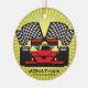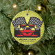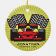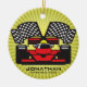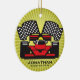 Ornamento personalizado do carro de corrida contra um fundo de explosão. Todo texto personalizável, frente e verso!