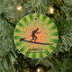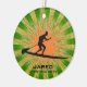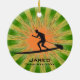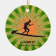 Paddleboard Personalizado Ornament Natal 20XX. Um cartaz se posiciona sobre um conselho contra um fundo verde e laranja de estouro. Todo texto personalizável, frente e verso!