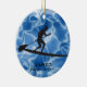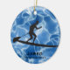 Paddleboard Personalizado Ornament Natal 20XX. Um cartucho se coloca sobre um conselho contra um fundo de água azul. Todo texto personalizável, frente e verso!