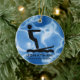 Ornamento personalizado de esqui d'água Natal 20xx em um fundo de água ondulada azul, com texto personalizável.