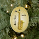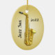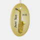 Ornamento de árvore de Natal para jogadores saxofônicos. O ornamento oval, de cor Dourada, é feito de cerâmica e tem uma corda para pendurar. Personalize com data, nome e foto do músico. Personalize ambos os lados.