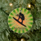 Ornamento de Navegação com personalização personalizável. Surfer em um conselho se posiciona contra um design verde e orang e starburst.