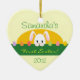 Um adorável ornamento cerâmico de dois lados do coelho de primeira Páscoa. O ornamento tem forma cardíaca e apresenta um coelho bonito em um jardim de primavera com ovos de Páscoa sobre fundo cerâmico amarelo-claro. O ornamento diz "Primeira Páscoa" em uma adorável carta verde, com áreas de modelo para você personalizá-la com o nome e o ano do seu filho. Para alterar a cor, o estilo ou o tamanho da fonte, basta clicar em 'personalizar' e essas opções também estarão disponíveis para você. Um enfeite especial para adicionar à sua árvore de feriados ou decoração de feriados de Páscoa, e é um presente de feriado excelente para amigos e familiares também! Este design de coelhinho de espionagem está disponível em cartões e outros itens de presentes também. Por favor, visite nosso compro por mais Páscoas, e primavera saudando cartões, selos, presentes e muito mais!