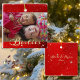 Celebrar amizades com um ornamento de feriado com suas fotos em um fundo vermelho estrelado. Adicione seus nomes e o ano ao fundo do ornamento.