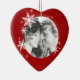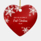 Enfeites de natal em forma de coração personalizado com design moderna apresentando flocos de neve brancos no inverno em vermelho, foto redonda e texto personalizado no verso. Uma bela guarita para o seu primeiro Natal juntos! Personalize-o com sua foto e texto personalizado no verso ou personalize-o ainda mais se você quiser ajustar o layout em ambos os lados ou escolher uma forma de ornamento diferente.
