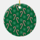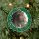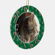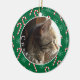 Um ornamento verde da árvore de Natal com a foto do seu gato favorito. Personalize-o com o nome do seu gato e o ano. As costas têm uma cana doce e um padrão de flocos de neve. Também disponível em vermelho. © ArianeC Ilustrações — Todos os direitos reservados