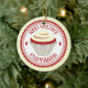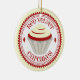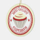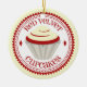 Um ornamento que caracteriza uma ilustração de um cupcake vermelho de veludo com crosta de gelo branca dentro de um círculo vermelho e branco decorativo com texto vermelho.