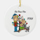 Um ornamento cerâmico bonito e divertido, com um pai, mãe, menino de criança, menina de criança, e cão de cinza em frente à árvore de férias!