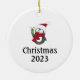 Um pinguim giro se senta sobre uma pilha de neve segurando um presente de Natal. Personalize o nome com apenas alguns cliques. A parte de trás do ornamento diz "Natal 2019" e também pode ser personalizada.