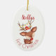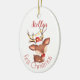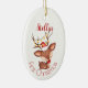 Primeiro ornamento de Natal personalizado com o nome do bebê e um veado de bebê bonitinho em um chapéu de Papai Noel. O nome e o escrevendo podem ser alterados, assim como a cor do escrevendo, o que fará uma bela manutenção, assim como uma na moda na árvore de Natal.