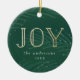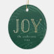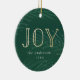 Adicione um toque personalizado à sua árvore com nosso ornamento de feriado do Winter Branches. O Enfeites de natal apresenta "Joy" em letras falsas de folha de ouro contra um fundo verde de cor d'água com galhos de pinheiro e neve. Personalize o ornamento adicionando seu nome, o ano e uma foto no verso.