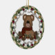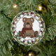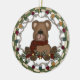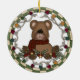 Um ursinho castanho com um cachecol preto e vermelho, cones de pínus, e um conjunto de luzes de férias em várias cores é apresentado em um ornamento de feriado redondo de porcelana!