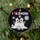 Dois ursos polares se envolvem em um abraço de urso enquanto os flocos de neve caem e o texto lê "I Love Snow" nos ornamentos de feriados que você pode mudar a forma antes de pedir!