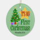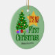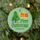 Divertido e fofo personalizado O Primeiro Ornento de Natal do Bebê. Excelente para o primeiro natal do bebê ou da menina. Adicione seu próprio título em frente e atrás de dois lados. Apresenta uma estrela amarela, uma fonte de diversão retrógrada, presentes coloridos debaixo da árvore e uma árvore de Natal fofa com estrela dourada.