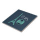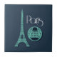 Esta arte caracteriza um design da torre Eiffel na cerceta em um fundo azul escuro.