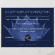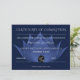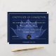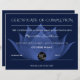 Certificado de conclusão elegante para os cursos de formação de ioga e de reiki realizados com uma flor de lótus de efeito moiré bela e moderna. Texto e logotipo para personalizar. Cor principal: azul da meia-noite. Se o certificado for preenchido à mão, utilizar uma caneta de tinta branca, prateada ou dourada.