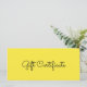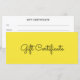 Certificado de presente comercial amarelo com fundo amarelo elegante e sólido na frente e branco atrás. Você pode usar este vale-presente para salão de beleza, spa, pequeno negócio, certificado de presente de varejo, cabelos e maquiagem, terapeuta de estúdio de ioga ou qualquer outra empresa. Veja a nossa coleção de lojas abaixo para obter mais certificados de presentes.