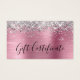 Design moderno de vidro feminino para seus pequenos certificados de presentes de cartão de visita. Todos os textos e linhas são personalizáveis se você precisar de informações diferentes enquanto cria seus próprios cartões-presente. Se você precisar de mais de duas linhas para suas informações de contato, há muito espaço para mover os diferentes elementos. A falso brilho prateado contra uma rosa claro falsa escovou imagens gráficas digitais de folhas metálicas nesta impressão design como uma foto.