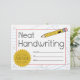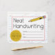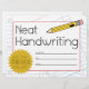 Um certificado de prêmio em sala de aula para recompensar os alunos pela sua caligrafia. O plano de fundo é a ilustração do papel do notebook. A design inclui também ilustrações de um lápis amarelo e de um selo dourado.