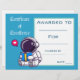 Um Certificado de Prêmio de Leitura colorido brilhante adequado para uso por um professor numa sala de aula ou apresentação de montagem escolar. Este certificado de astronauta azul apresenta uma imagem de um astronauta e pode ser personalizado para incluir o nome do aluno e a conquista pessoal. A data e o nome do professor também podem ser personalizados. Simples e fácil de preencher. Bom recurso do professor.