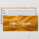 Cartão de folha metálica dourada. Certificado de presente personalizado.