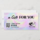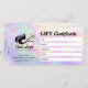 Aumente suas vendas de certificados de presentes com esses belos certificados holográficos de presentes. O design iridescente e o logotipo personalizável criam uma experiência memorável e luxuosa de dar presentes, encorajando os clientes a comprar e os destinatários a resgatar.