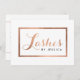Coordena-se com o Modelo de cartão de negócios de quadro de texto do script Lashes Glam, Dourado, por Rosa de 1201AM. Um tipo de letra glamouroso e cursivo escreve "Lashes" em ouro falso rosa neste modelo de certificado de presente personalizável. Adicione seu nome ou nome comercial abaixo para obter um logotipo personalizado. Projetado para salões de extensão de pestanas, técnicos de lash, artistas de maquiagem e muito mais. © 1201AM CREATIVE