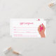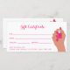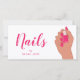 Certificado de presente comercial de salão de unhas moderno, com um simples design, ilustrando uma mão com unhas cor-de-rosa fuschia segurando uma garrafa de esmalte. A parte traseira tem o nome junto com "Unhas" pelo seu nome no script. Todo texto é rosa quente sobre fundo branco.