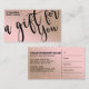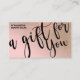 Este é o perfeito cartão de visita de certificado de presente para uma moda, na moda, menina, e empresária moderna. Este design apresenta uma típica tipografia de pincel preto manuscrito em uma falso brilho diagonal dourado e gradiente cor-de-rosa-claro glamouroso e fundo chic. É a maneira perfeita de permitir que seus clientes comprar um presente para sua família e amigos e, ao mesmo tempo, promova sua empresa. ***NOTA DE DESIGN IMPORTANTE: Para qualquer solicitação de design personalizada, como solicitações de correspondência de produtos, alterações de cor, mudanças de posicionamento ou qualquer outra solicitação de alteração, clique no botão "CONTACT" ou envie um e-mail ao designer diretamente em lafemme.art@gmail.com. Você pode até enviar um e-mail para ela solicitando um design completamente personalizado e novo.