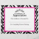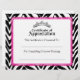 © 2013 Socialite Designs. Nossos desenhos de certificado de apreciação femininos têm uma tiara / coroa prateada, fundo com listras de zebra e borda de certificado com renda rosa. Um certificado maravilhoso para um concurso.