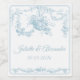 Adicione um toque francês refinado às mesas do seu casamento com esta etiqueta elegante para garrafa de casamento Toile de Jouy em uma paleta de azul suave em pó. Inspirada em gravuras francesas clássicas do século XVIII, o design apresenta uma moldura floral ornamentada e uma ilustração delicada de uma cesta de flores pendurada, criando uma estética atemporal e romântica.