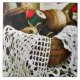 Cesta com lenha de fio e rendas enfiadas sobre o lado.