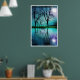 Árvores negras refletindo no lago.