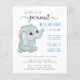 Um convite de chá para um bebê amigo do orçamento. "Nosso doce amendoim está a caminho" é escrito em uma mistura de tipografia de cinzas azuis e suaves e uma bonito escrita com pestanas. Personalize os nomes do bebê e da futura mãe na tipografia azul ao lado de uma aquarela fofa de um elefante bebê e adicione os detalhes do chá na simples tipografia moderna de cinzas.