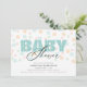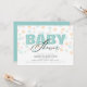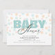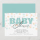 Este convite de chá de bebê é perfeito para um bebê menino ou uma bebê menina. Este design neutro em gênero oferece uma aparência moderna e minimalista com a palavra "bebê" aparecendo em azul claro e o fundo é um padrão de pontos em cores pastéis suaves.