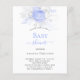 Para um Chá de fraldas celebrando um menino. Um fundo branco na moda. Decorados com flores claras, azuis e brancas, rosas e folhagem de prata falsa. Personalize e adicione um nome e detalhes da parte.