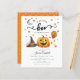 Um pequeno convite para chá de fraldas de abóbora de Halloween. Design moderno do Halloween para uma festa de dois! Este convite para o chá de fraldas apresenta uma abóbora, um chapéu de bruxa, um balão, cornos doces, uma lua e estrelas. Este convite é excelente para meninas e chás de garotos!