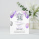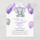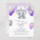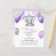 Este adorável convite para chás de fraldas apresenta elefante roxo e cinza com balões e confete. A parte traseira apresenta o plano de fundo de aquarela roxo suave. Facilmente personalizado para seu evento clicando em personalizar.