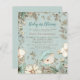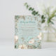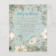 Bebê Em Chá de fraldas Bloom Bear Boy Convide. Um alternativo MENOR de 4,5" x 5,6", compatível com o orçamento. Disponível em um STOCK de PLACA SEMI GLOSS 110 lb ou um STOCK de PAPEL THINNER SATIN FINISH 80 lb. Os envelopes são um extra opcional. Este design de estilo vintage tem um urso fofo num boné a bater atrás de flores e folhagem. Você pode personalizar facilmente todo o texto de acordo com suas necessidades. Um fundo azul de pó coordenado está atrás.