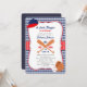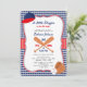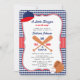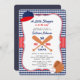 Um Pequeno Slugger está a caminho! Chá de fraldas de beisebol bonito convite Blue Gingham com banda vermelha listrada. Perfeito para uma celebração de chá de fraldas de meninos de beisebol.
