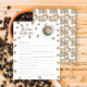 Café de cor aquosa, café e padrão de feijão. Chá de fraldas de café. Chá de fraldas temido com café. Texto com anel de café e com café e xícara de café.