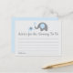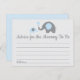 O nosso conselho de chás de fraldas para as Mamães Serem Cartões sobre os elefantes azuis e cinzas é uma atividade doce para se ter num chá de fraldas. Se quiser, você pode personalizar facilmente o título do cartão para ser "Conselhos para os Novos Pais" ou para usar o nome da mãe antes de adicionar os cartões ao seu carrinho.