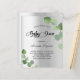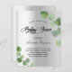 Um convite de chá de fraldas moderno, elegante e neutro em termos de gênero. Um fundo metálico de aparência fina prateada decorado com verde de eucalipto, prigs. Personalize e adicione um nome e detalhes da parte. Letras pretas coloridas.