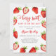 Cartão de convite para chá de fraldas de menina bonita com ilustração aquosa de morangos. O texto diz "um bebê doce de fruta está a caminho."