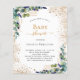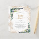 Bem-vindo a um Chá de fraldas elegante. Um fundo branco chic. Decorados com folhas de eucalipto, prigos, verde, folhas de ouro falso e pó de ouro, de cor aquosa verde. Personalize e adicione o nome da mãe a ser e os detalhes da parte. Letras pretas e ouros.