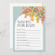 Uma atividade de chá de fraldas perfeita para convidados. Estas cartas fazem um excelente para a futura mãe. A design apresenta um grande conjunto de lindas flores coloridas de queda e é acentuada por uma caixa branca de vassoura e um fundo leve empoeirado.