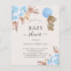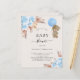 Para um chá de fraldas moderno estilo boho. Fundo branco. Decorado com flores azuis-claras, rosas, grama-pampas e um ursinho-peluche segurando um balão azul. Personalize e adicione um nome e detalhes da parte. 1 folha = 1 convite impresso de borda a borda.
