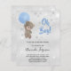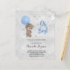 Para um chá de fraldas celebrando um menino. Um fundo metálico falso prateado. Um ursinho de pelúcia segurando estrelas de balões azuis e poeira brilhante fraca. Personalize e adicione o nome da mãe a ser e os detalhes da festa. O nome e o texto: Oh Boy! são escritos com um estilo escrito à mão
