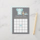 Um pequeno pássaro marrom segura um guarda-chuva de bolinhas amarela e se posiciona doce e pacientemente próximo a um bebê elefante azul claro vestindo um par de fraldas com um pino de fralda azul nele. Esta folha de bingo de chá de fraldas elefante é perfeita e uma maneira divertida de celebrar a nova mãe esperando um bebê. Trabalho de arte © Chrissy H. Studios, LLC. Todos os direitos reservados.