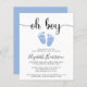 Chá de bebê bonitinho, amigável em orçamento, por convite por correio com "oh boy" em um roteiro de na moda com baloiços e uma coloração aquosa azul pastel de pés de bebês. Por baixo, você pode personalizar facilmente o chá por detalhes de e-mail.